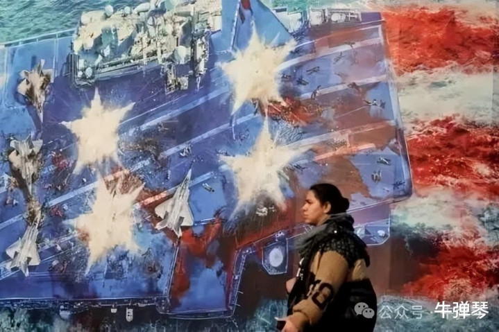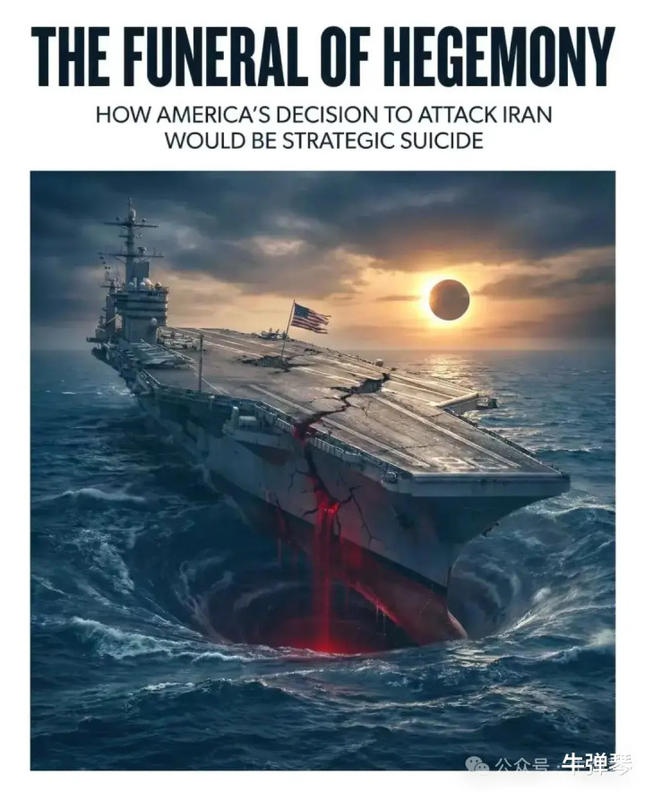 我看到,还有海报展示美国航母被摧毁的场景,文章的标题则是:“霸权的葬礼,美国决定攻击伊朗将是一场战略自杀”。